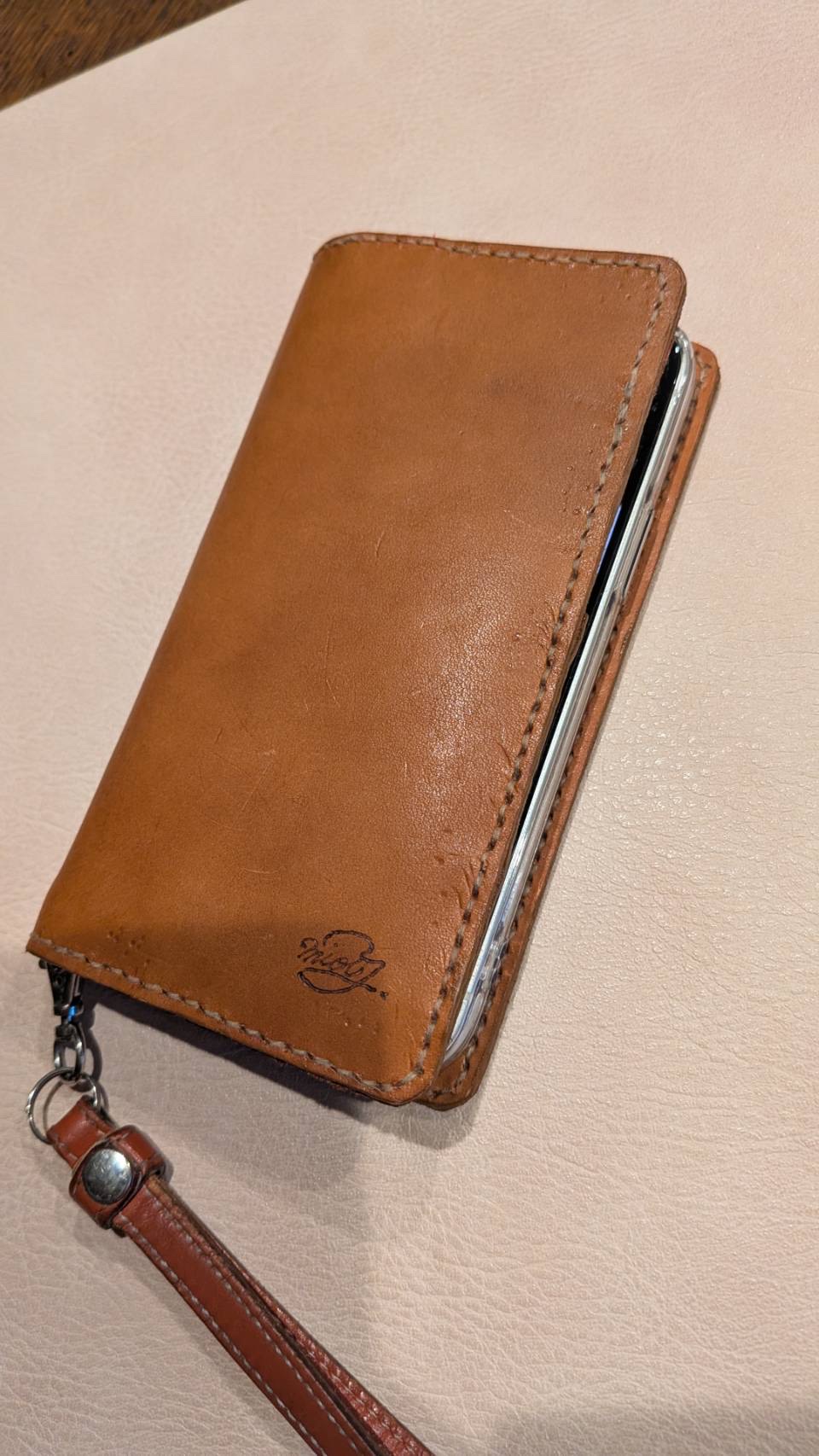 携帯ケースが古くなったので 同じデザインで同じ皮の残りで作りました ちょっと思い出しながら ロウ引きの糸で2本の針を使って手縫いをしました ひたすら縫い付けていく作業ですが この職人業のような物作り感がとっても好きなこと…