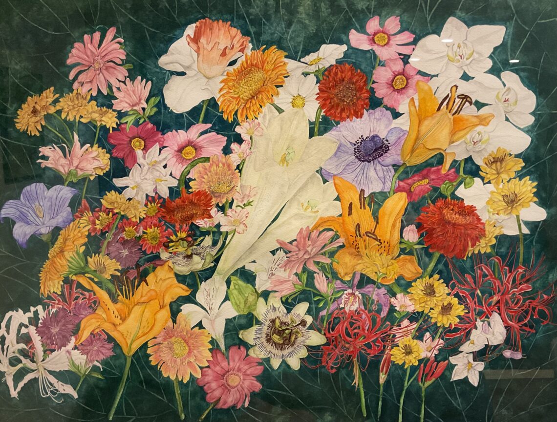 2008 新美展で入選した作品 当時まだ現役で通勤の時目に入る花々 その時々に写真に収め 時には野花を積んで持ち帰りスケッチしたり 白い画紙にその度に描き加える作業をした 花々には色や形があり 毒々しいものや凛とした優雅…